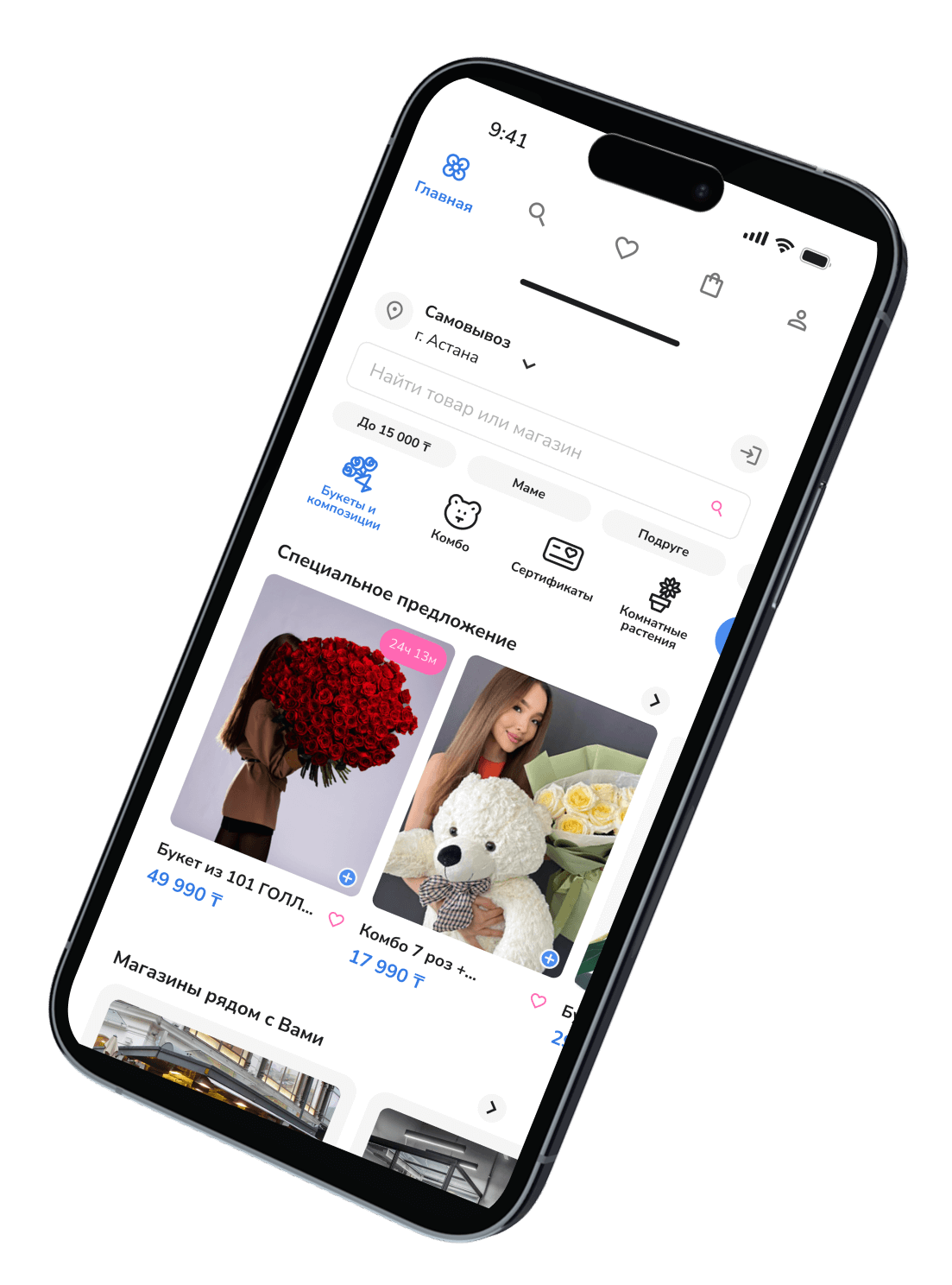Первый в Казахстане маркетплейс, где цветы можно заказать за пару кликов с доставкой за 30 минут.